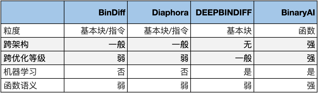 对以上工具/研究及BinaryAI最新比对算法进行简单的对比: